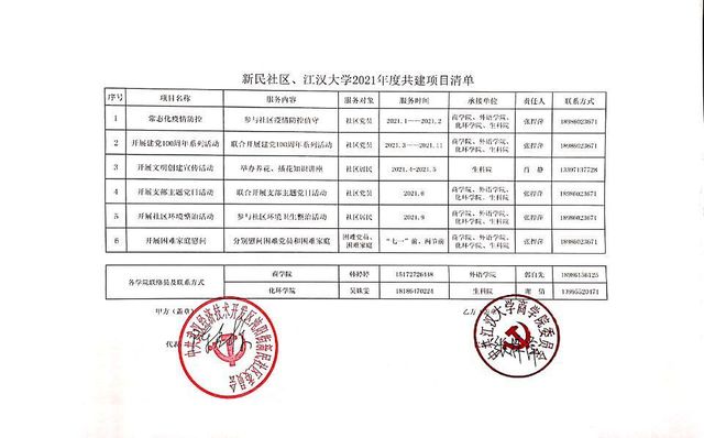 经协商,吃瓜网 、外国语学院、化学与环境工程学院和生命科学学院党委与新民社区党委于4月1日签订2021年度共建项目清单。共建项目包含常态化疫情防控、联合开展建党100周年系列活动、举办养花插花知识讲座、联合开展支部主题党日活动、参与社区环境卫生整治活动、慰问困难党员和困难家庭等6项服务内容。
