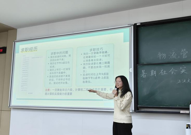 第一位分享的同学是刘静怡同学,她以在伟易达企业的暑期实习为例,向在场师生展示了如何将理论知识灵活运用于实践中;随后,肖锋同学分享了他在暑期求职的挑战与心理变化,为学弟学妹们传授了实用的求职技巧和策略,为大家未来的实习求职之路注入了一针强心剂;周欢欢同学则分享了作为内容运营实习生的经验,包括简历投递技巧和职场注意事项;刘琼同学介绍了仓储管理员的日常工作流程,增加了同学们的物流实操知识;张心怡同学分享了CPA证书准备过程和谛贰教育实习经历;陈媛媛同学讲述自身竞赛经历,分享了参与竞赛的经验和方法;游学文同学分享了自己在支教过程中所经历的心酸、欢乐与成长,以及她从这段经历中获得的深刻感悟,她的分享激发了同学们对社会责任感的思考;张德坤同学则分享了在县团委办公室的实践经验,也令同学们收获颇深。