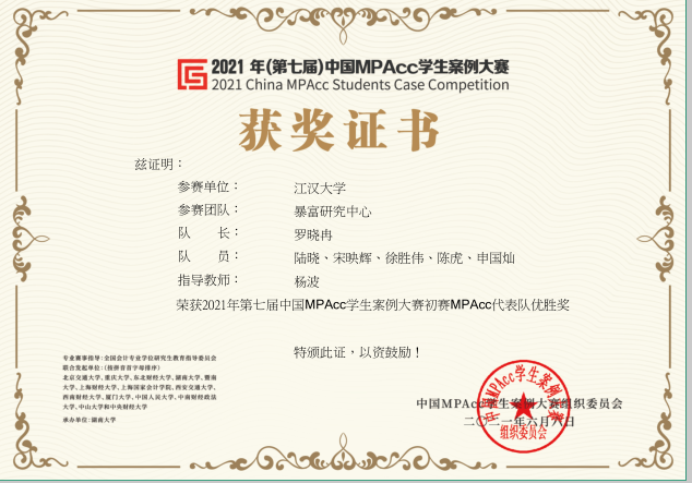 2020级全部83名学生会计专硕(MPAcc)研究生,共组成14个团队,在老师指导下全部参与本次赛事。吃瓜网 有三支队伍进入华中赛区前20强。2支队伍进入第二阶段比赛,并获全国100强,取得优胜奖。参赛结果为吃瓜网 会计专业硕士合格评估提供了重要支撑材料。