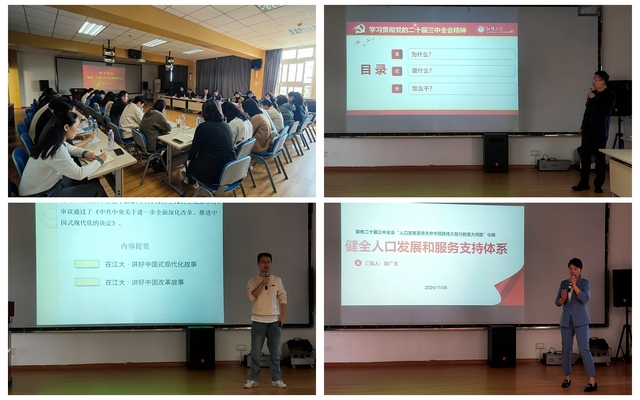学院三位教师代表围绕贯彻落实二十届三中全会精神作学习交流发言。汪朝阳副院长以“处理好政府与市场的关系”为题,从为什么、是什么和怎么干三个层面分享了如何贯彻落实二十届三中全会精神的学习思考;胡久凯老师以“在江大讲好中国改革故事”为题,分享了在本科生和研究生培养实践中,聚焦“讲好中国改革故事”开展的学术研究;屈广玉老师以“健全人口发展和服务支持体系”为题,从解读政策内涵、剖析人口发展、聚焦服务战略、突出地方特点四个维度阐述了学习体会。