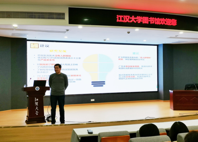 讲座伊始,李占风教授以“全国大学生市场调查与分析大赛写作规范与技巧”为主题进行宣讲,分别对组队、选题、方案设计、数据调查检验等方面逐个展开,并详细阐述了诸如二元选择Logit模型、RFM模型等多个常用数据处理模型的使用方法。李占风教授以近年来荣获国家级奖项的各大高校参赛作品为例,针对具体问题详细剖析了各个模块的相关要求及评分标准,并重点分析了参赛作品之一《“青丝搔更少,防脱要趁早”——武汉市大学生防脱发洗发水使用现状与发展策略研究》,通过深入分析该报告需要改进的问题和值得借鉴的优点,使本次讲座的相关知识点得到深化,大大提升了学生的理解、接受能力。
