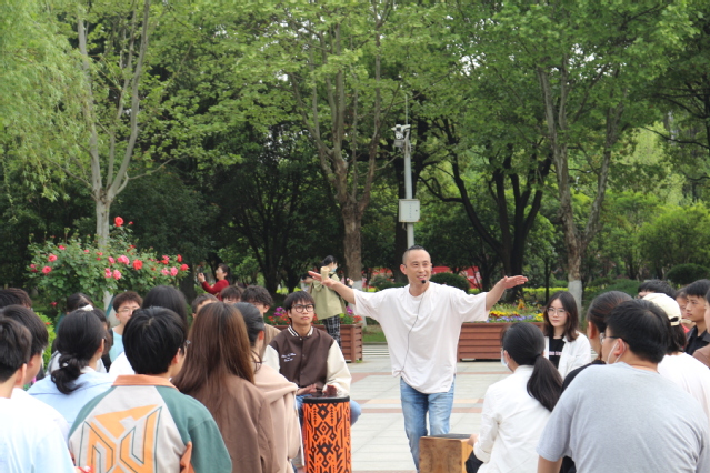 活动伊始,大家围坐成圈,助理给参与师生分发了非洲鼓、土巴诺鼓、沙锤、棒铃、手铃、三角铁、木鱼等乐器。张老师指导大家先熟悉乐器,并用手势指挥参与者尝试压拍子。随后他引入找木鱼破冰游戏,在互动中,大家较快熟悉彼此,轻松愉悦融入到活动中来。接下来,“拍一拍”游戏,张老师引导大家根据鼓声敲打节律,拍打左右相邻同学的肩膀,同学们逐步建立心理联接,默契度也提升了不少。张老师借助身体语言发出各种节拍指令,在场师生击打各种乐器,协同合作创编出悦耳的曲调,演奏此起彼伏,洋溢着青春的活力。