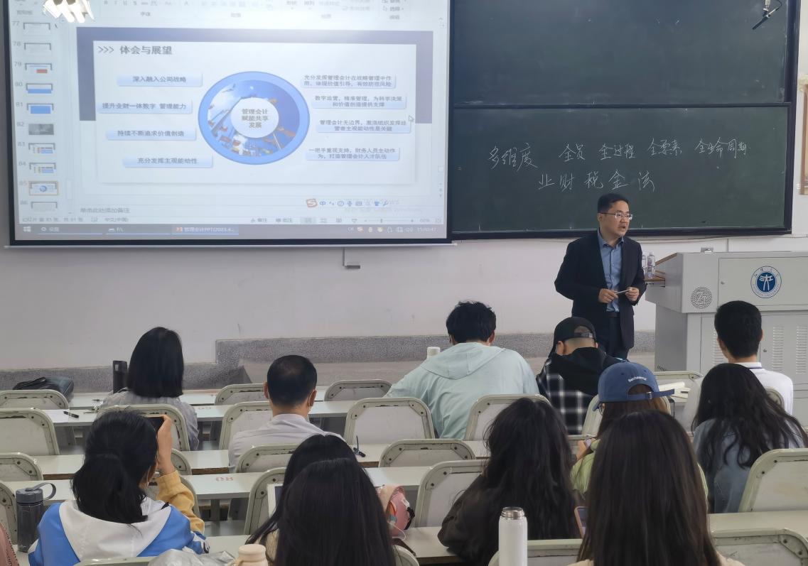 蒋总从行业前沿到企业实践再到人才需求分享了他的经验与思考,勉励同学们除了深入专业学习,还要坚持锻炼广泛阅读,并借用习近平总书记的话激励同学们:一以贯之,久久为功互动环节时多名研究生踊跃提问,蒋毓翔总会计师从实务界的角度详细的回应了同学们有关财务思维、信息获取与筛选、人工智能对会计职能的挑战等方面的问题。
