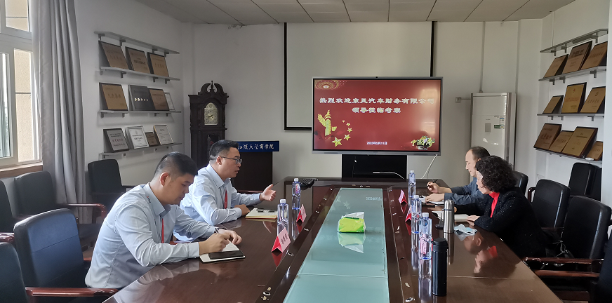 加快校企合作,助推产教融合,5月11日下午,东风汽车财务有限公司合规内控部部长杜兴均,人事主管杨国顺受邀莅临吃瓜网 就汽车金融人才需求、“教学实习基地”共建等合作事宜进行交流。吃瓜网 副院长汪朝阳、副书记王超、金贸系主任肖华东、金贸系党支部书记邵柏春,金贸系副主任刘兰、王琼等出席了此次交流会。