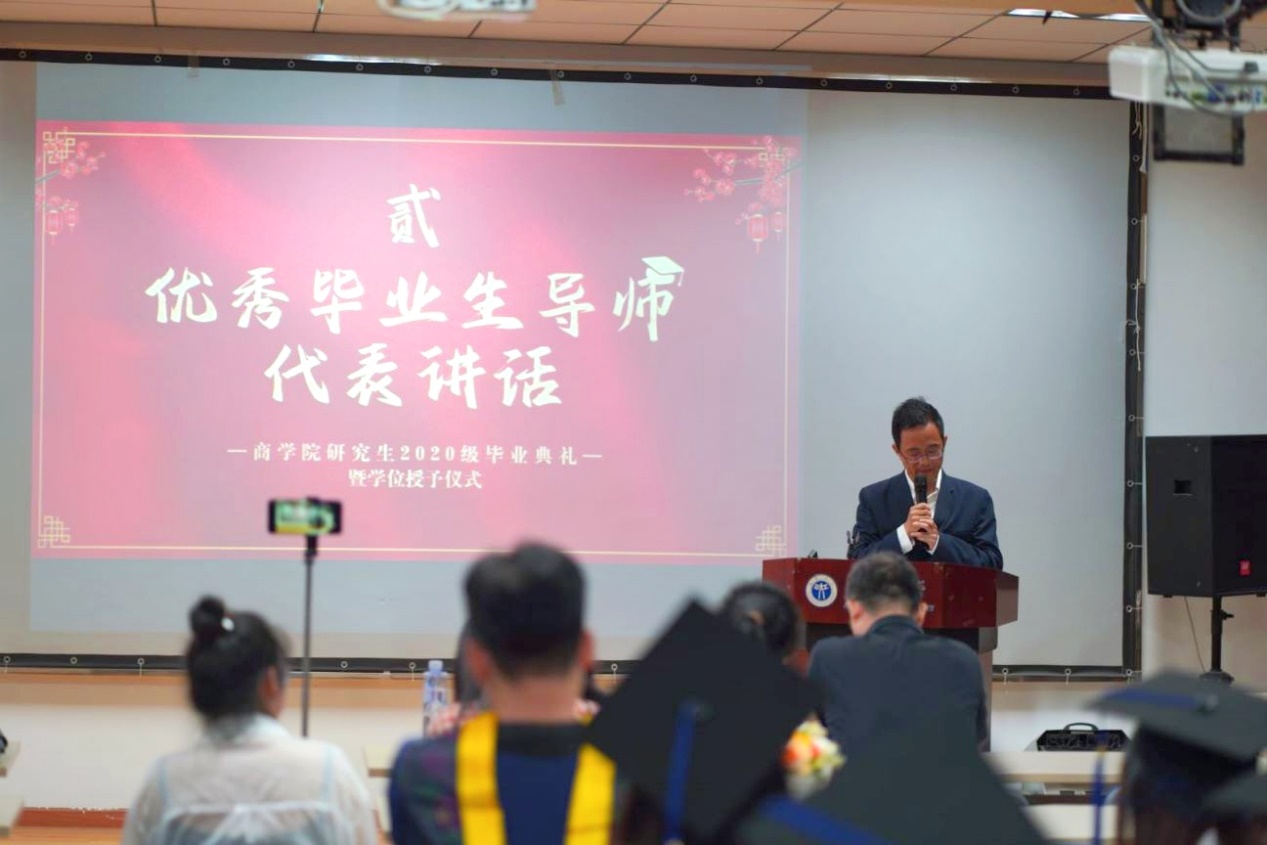 学贵得师,亦贵得友。每一位导师在学生的求学路中都付出良多,杨波老师作为优秀毕业生导师代表上台讲话时更是以“吃苦”和“享福”为主题,对同学们提出了殷切期望,希望同学们在今后的工作中敢吃苦、要吃苦、能吃苦,先苦后甜,不能在“享福”的错觉中迷失自己。