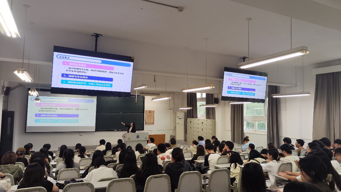 随后系副主任王倍介绍了毕业论文工作的相关安排,包括毕业论文的导师分配情况、选题注意事项、完成时间表、相关规定等,希望同学们积极和指导老师保持联系,响应院领导号召,高质量完成论文相关工作。