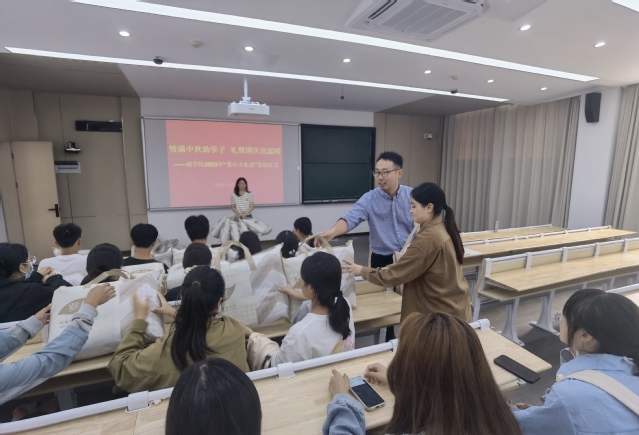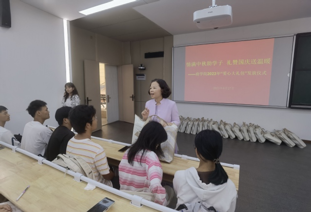 在中秋节、国庆节来临之际,吃瓜网 于9月27日中午在J01A101以“情满中秋助学子礼赞国庆送温暖”为主题开展2023年爱心大礼包发放活动。吃瓜网 党委副书记王超老师和学办辅导员们为2023级部分办理了生源地贷款的新生送去了校资助中心及学院为新生准备的爱心大礼包,同时送去中秋、国庆的祝福。