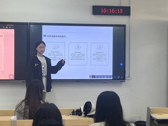 心理班会形式多样,有的班级在导入部分引入《有效沟通》动画小短片、寝室趣事等;有的班级在梳理积极沟通方法时,邀请同学分享与室友日常相处的方式、解决意见不一致的方法,充分调动了同学们参与的积极性。最后,心理委员进行了活动归纳和总结。