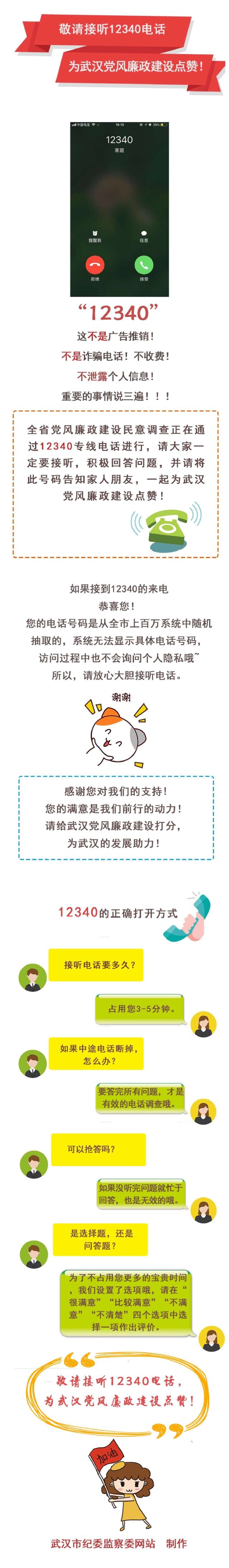 接上级通知,全省党风廉政建设民意调查正在通过12340电话专线进行随机抽访。各部门、各学院、各单位党委要高度重视,层层压实责任,在工作群广泛宣传发动,利用学院(部门、单位)网站、微信公众号、宣传栏等,使广大群众知晓12340电话,配合党风廉政建设民意调查,耐心接听电话,积极为武汉党风廉政建设点赞。党员干部要带头讲政治、顾大局,传播“正能量”,在微信朋友圈中积极转发宣传(市纪委监委网站主页“敬请接听12340电话,为武汉党风廉政建设点赞!”//www.whdi.gov.cn/tu/201811/t20181121_787961.shtml),确保党员干部全覆盖。