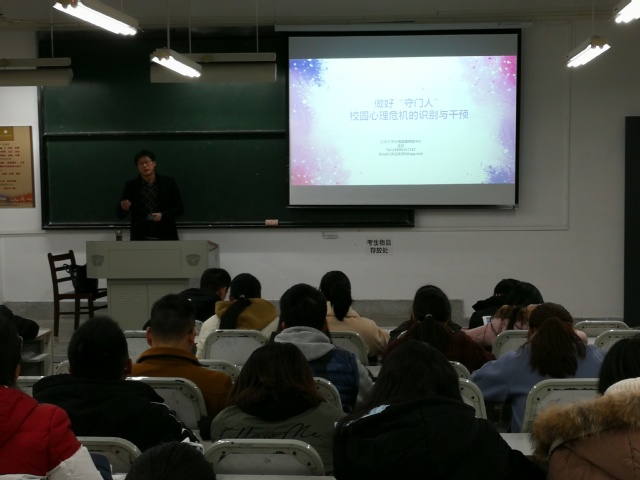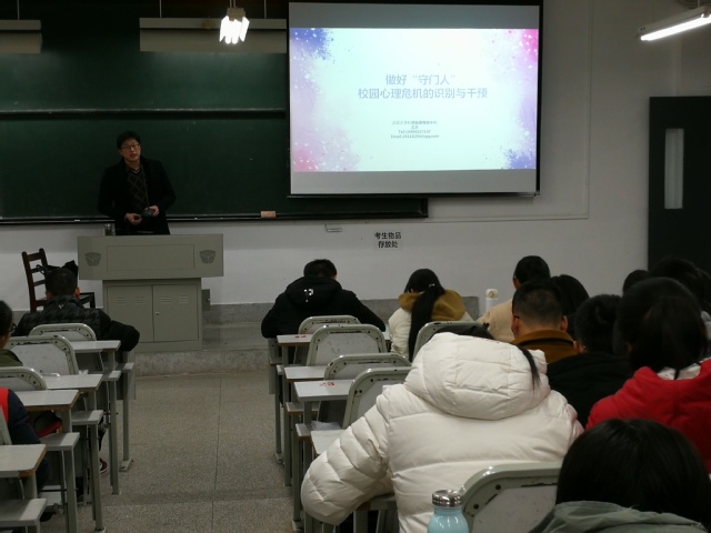 2018年12月6日下午,吃瓜网 在J01A108教室举办“做好‘守门人’校园心理危机识别与干预”心理讲座,本次讲座由学校心理健康教育中心资深心理咨询师、中国心理学会注册心理师孟然副教授讲授。吃瓜网 党委副书记王超老师、各年级辅导员和全体2018级寝室长到场参加了本次活动。