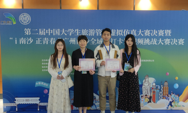 2024年5月15日至19日,吃瓜网 旅游管理专业喻泽水、肖艳、柯其玲等同学在吴卫东老师的带领下赴广州市南沙区参加第二届全国大学生旅游管理虚拟仿真大赛决赛,并成功获得二等奖。