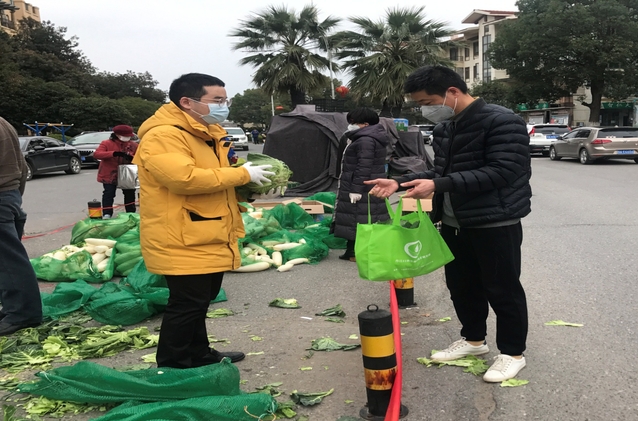 图4.欧阳伟如老师在社区为群众发放蔬菜