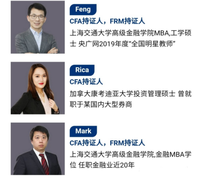 在授课中,该班所有CFA专业课程均由高顿财经委派具备知名金融企业高管履历的专业师资团队担任。所有授课讲师均持有CFA资质,授课经验丰富,其中更有许多直接来自于花旗、汇丰、摩根斯坦利、中信证券等金融机构。