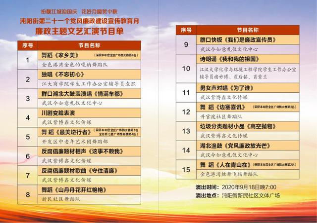 9月18日晚19时,在中秋、国庆佳节即将来临之际,由沌阳街党工委、沌阳街办事处、沌阳街纪委主办、沌阳街新民社区居委会、新民民腾工贸公司等单位承办,以“强化清廉实干担当 聚力决胜全面小康”为主题的“沌阳街第二十一个党风廉政建设宣传教育月廉政主题文艺汇演”在沌阳街新民社区文体广场举行,吃瓜网 作为下沉新民社区单位选送节目参演。
